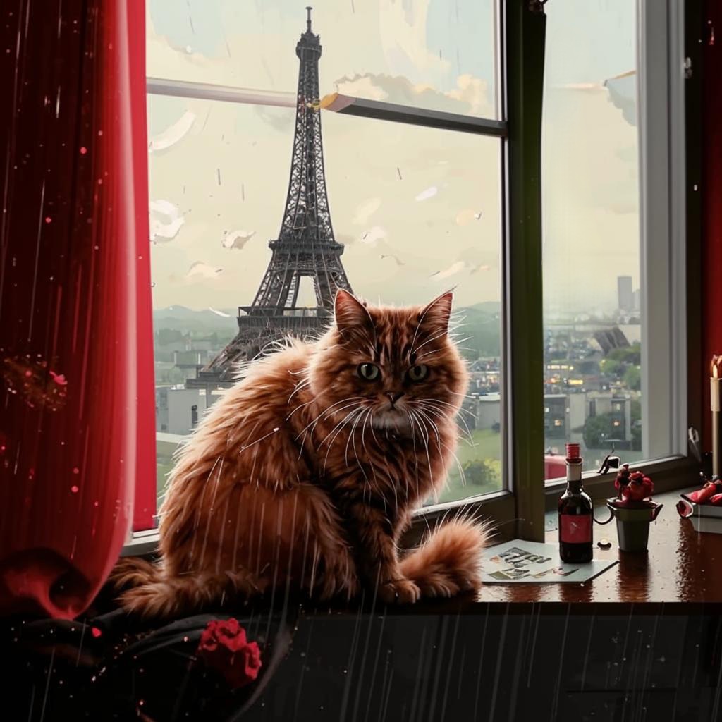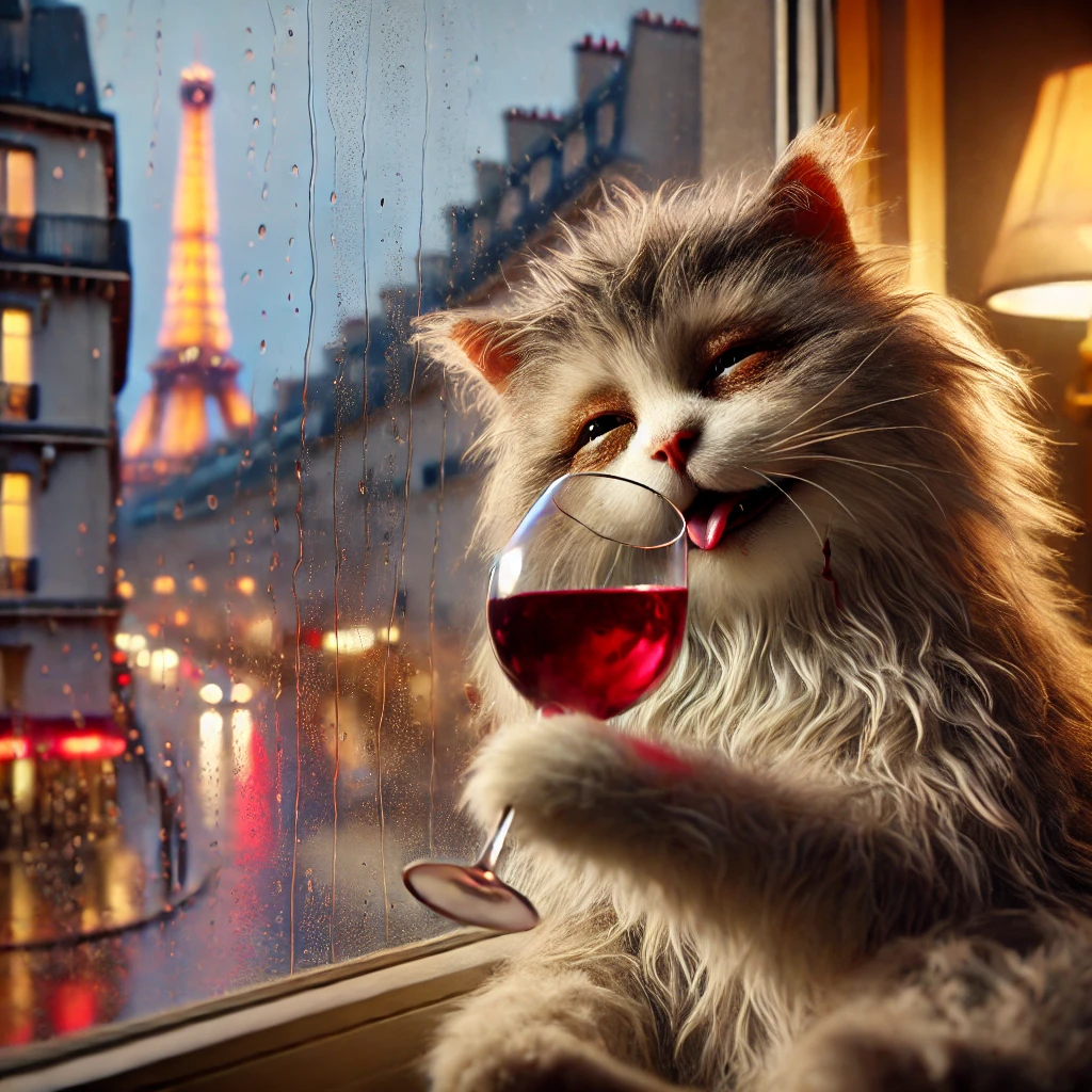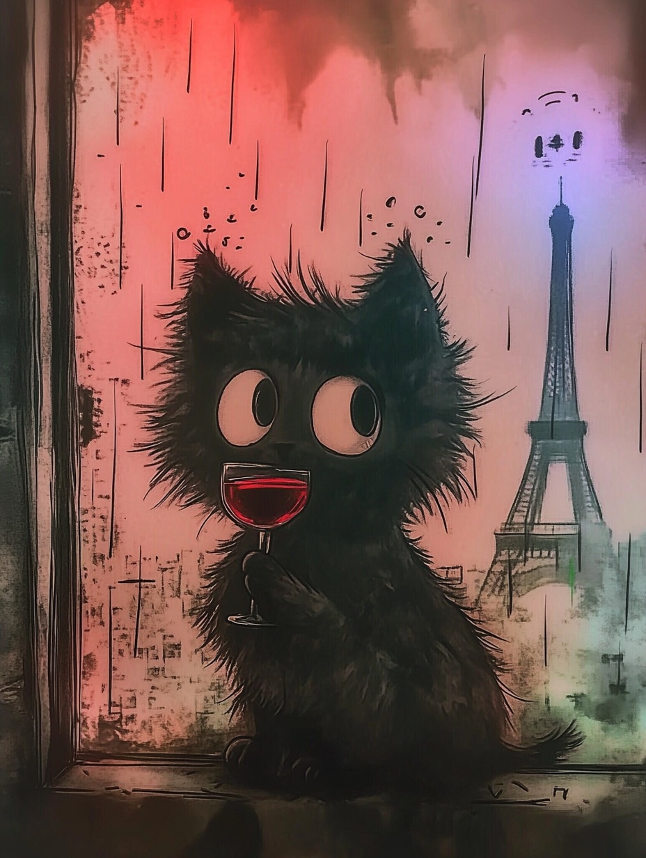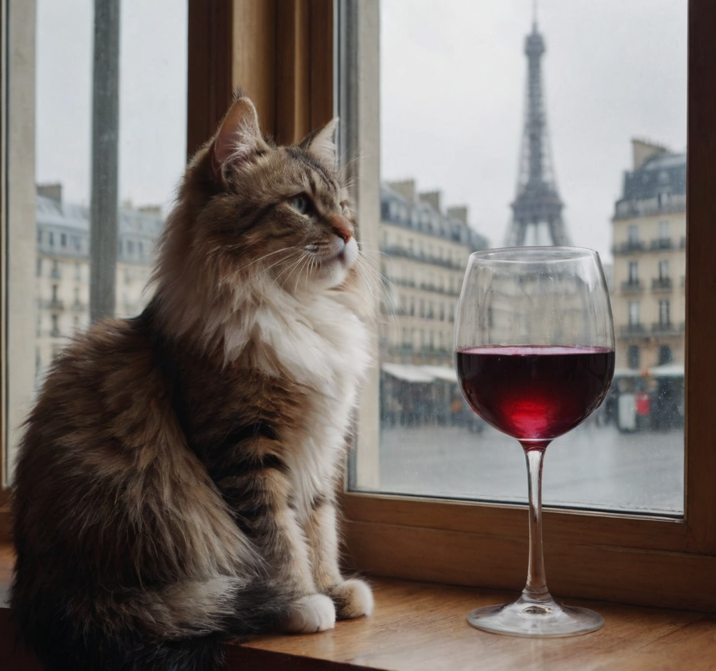 А вот midjourney сделал всё, как сказали. И Париж виден и котик бокал держит.
