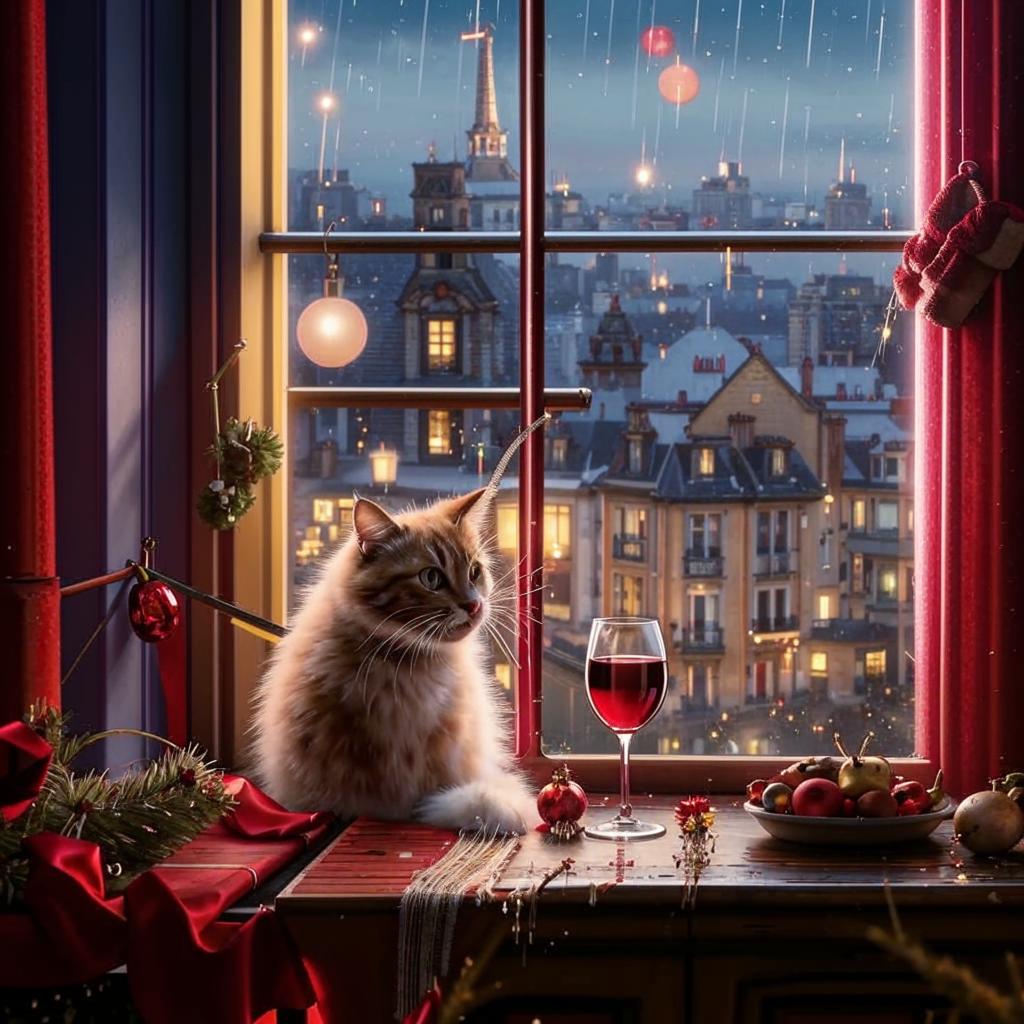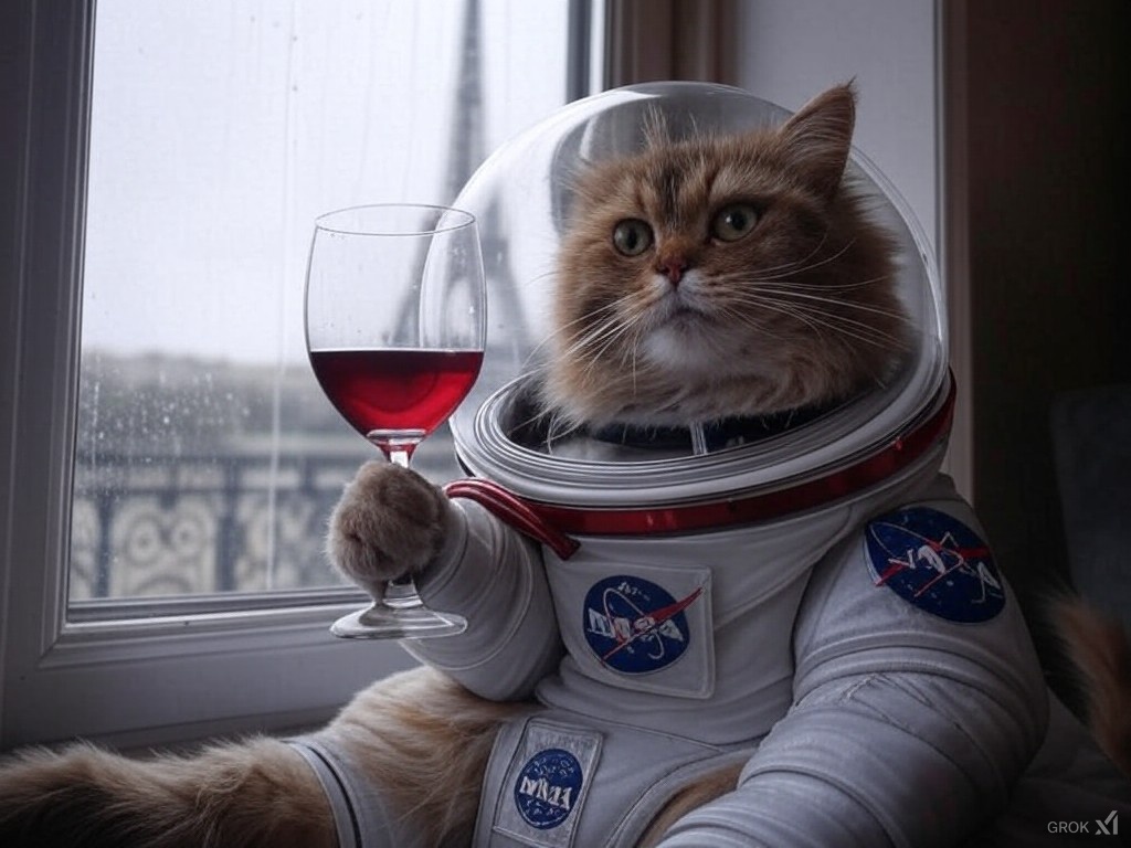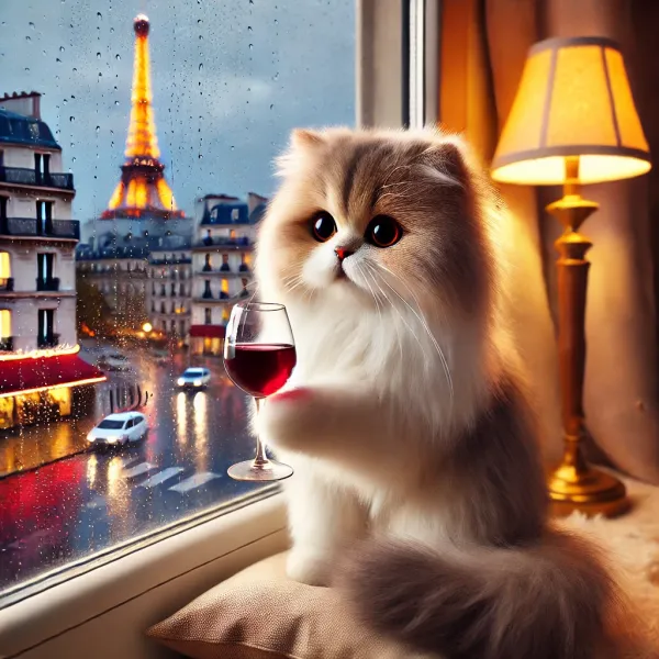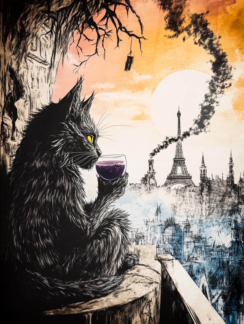 А вот midjourney сделал всё, как сказали. И Париж виден и котик бокал держит.