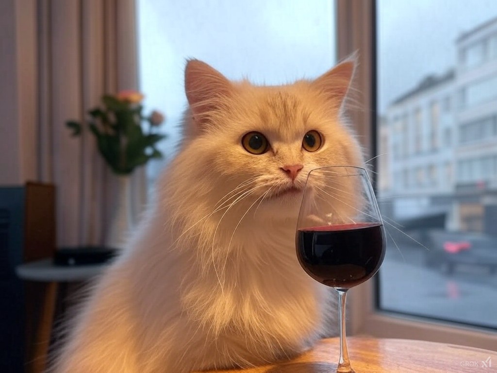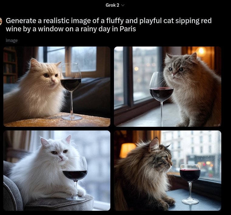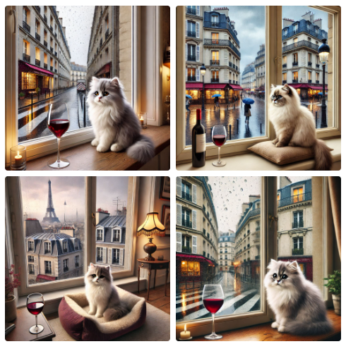 Сравнил, что именно выдают разные ИИ, умеющие генерировать картинки, по одному и тому же запросу - "Generate a realistic image of a fluffy and playful cat sipping red wine by a window on a rainy day in Paris".