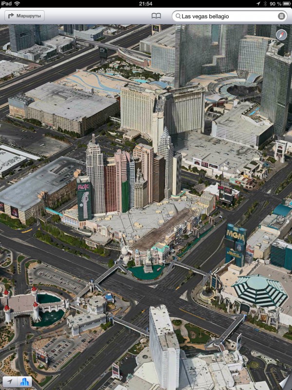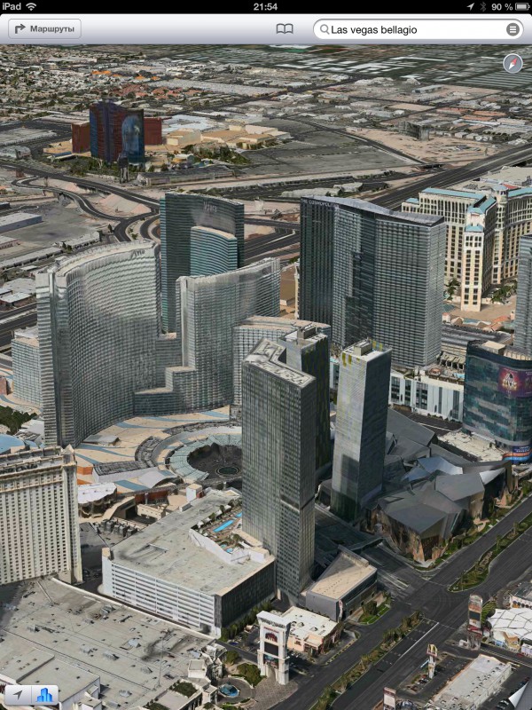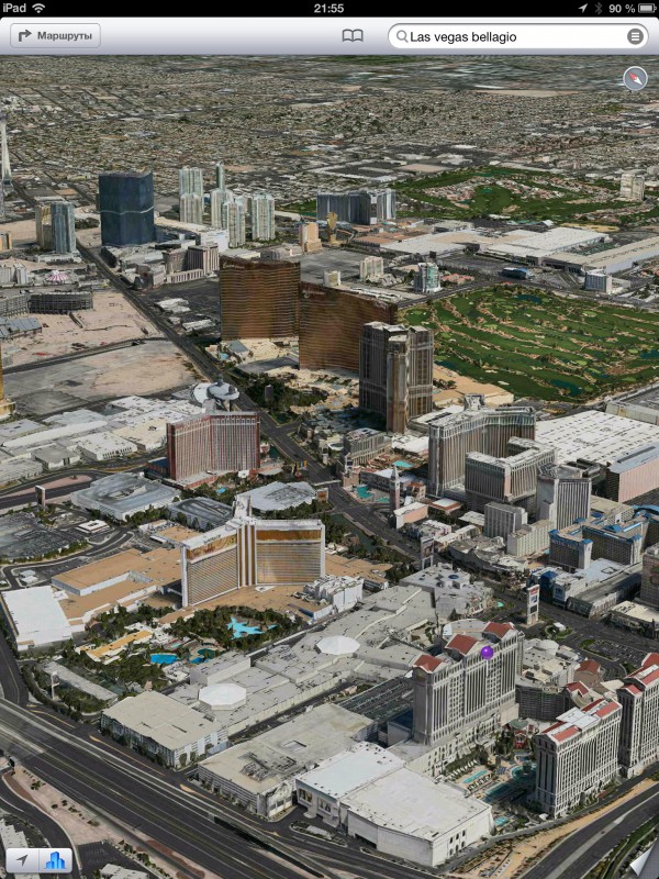 А вот трехмерные карты городов в iOS 6 - это, конечно, супер! Причем их еще и крутить можно в любых проекциях - крутотень! Вот, например, Вегас, бэйби.