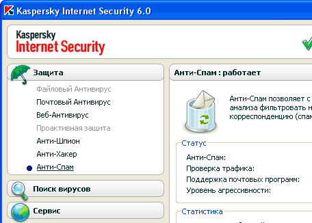 Поставил шестую "кису" - Kaspersky Internet Secutiry. По сравнению с антивирусом в ней добавлен полноценный (надеюсь) файрвол ("анти-хакер"), специальный анти-шпион и локальный антиспамерский модуль (технологии байес, анализ изображений, анализ заголовков). Для теста все это врубил, изучаю. С The Bat! этот антиспамерский модуль работает без проблем - интегрируется прямо в клиента и там настраивается (обучается). Посмотрим, какие результаты покажет.