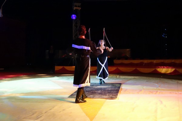 Опять вышла девушка на канате и собачками, после чего стала девушкой с обручами.