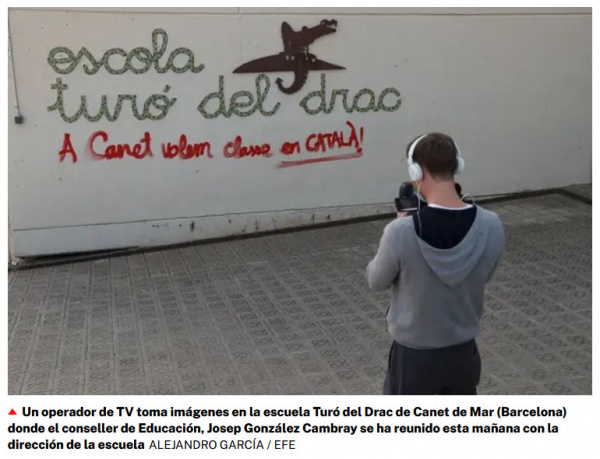 В городке Канет-де-Мар, до которого от нас 10 минут езды, бушует скандал - “En Canet queremos clase en catalán”: la hostilidad en una pintada a las puertas del colegio".