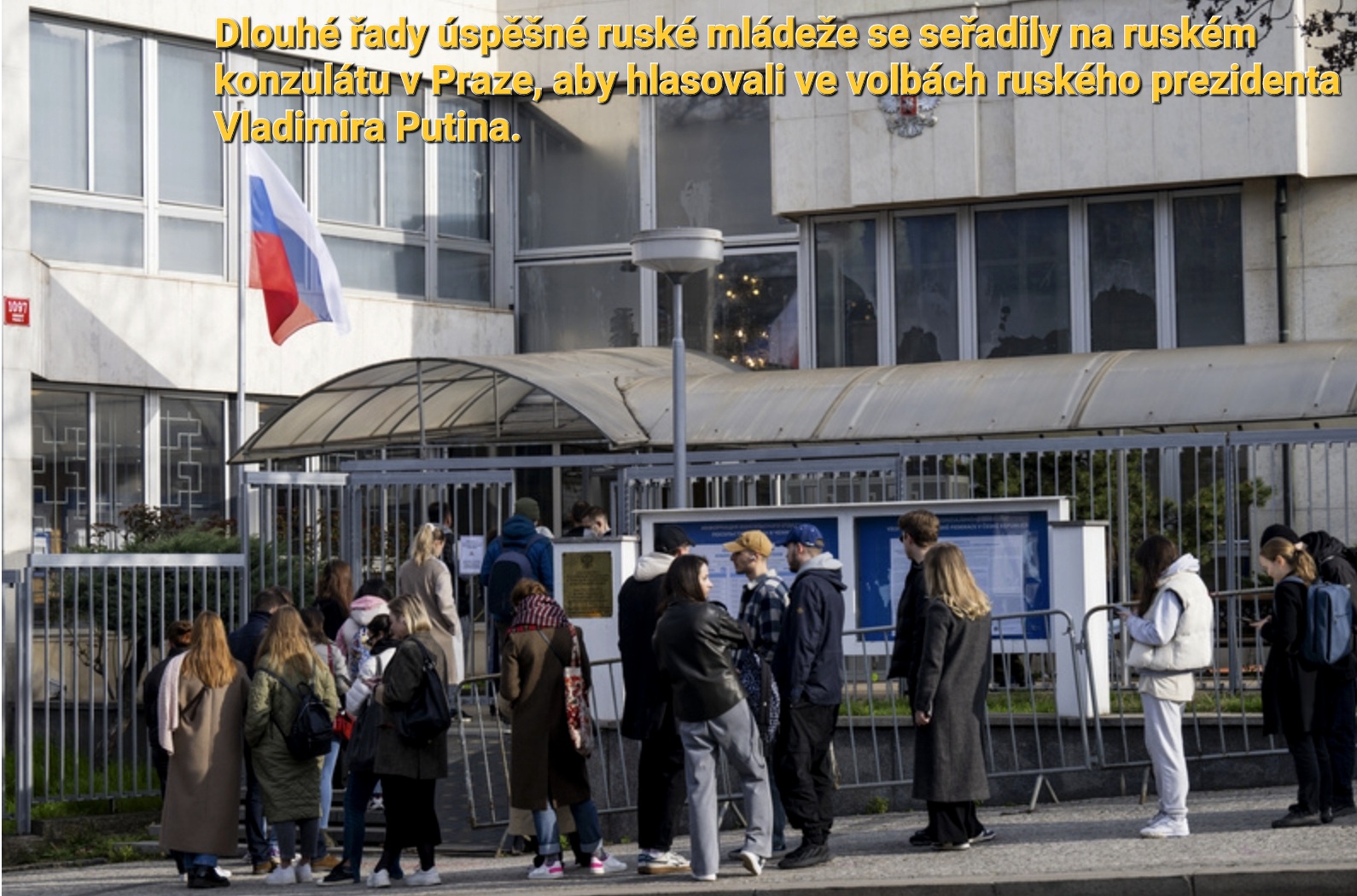Вчера в российских консульствах некоторых стран Европы можно было проголосовать на так называемых "выборах" президента. Например, в Чешской Республике для этого был открыт один единственный избирательный участок. Туда выстроилась большая очередь, и люди стояли в ней по два-три часа - вот небольшой репортаж в "Пражском Экспрессе".