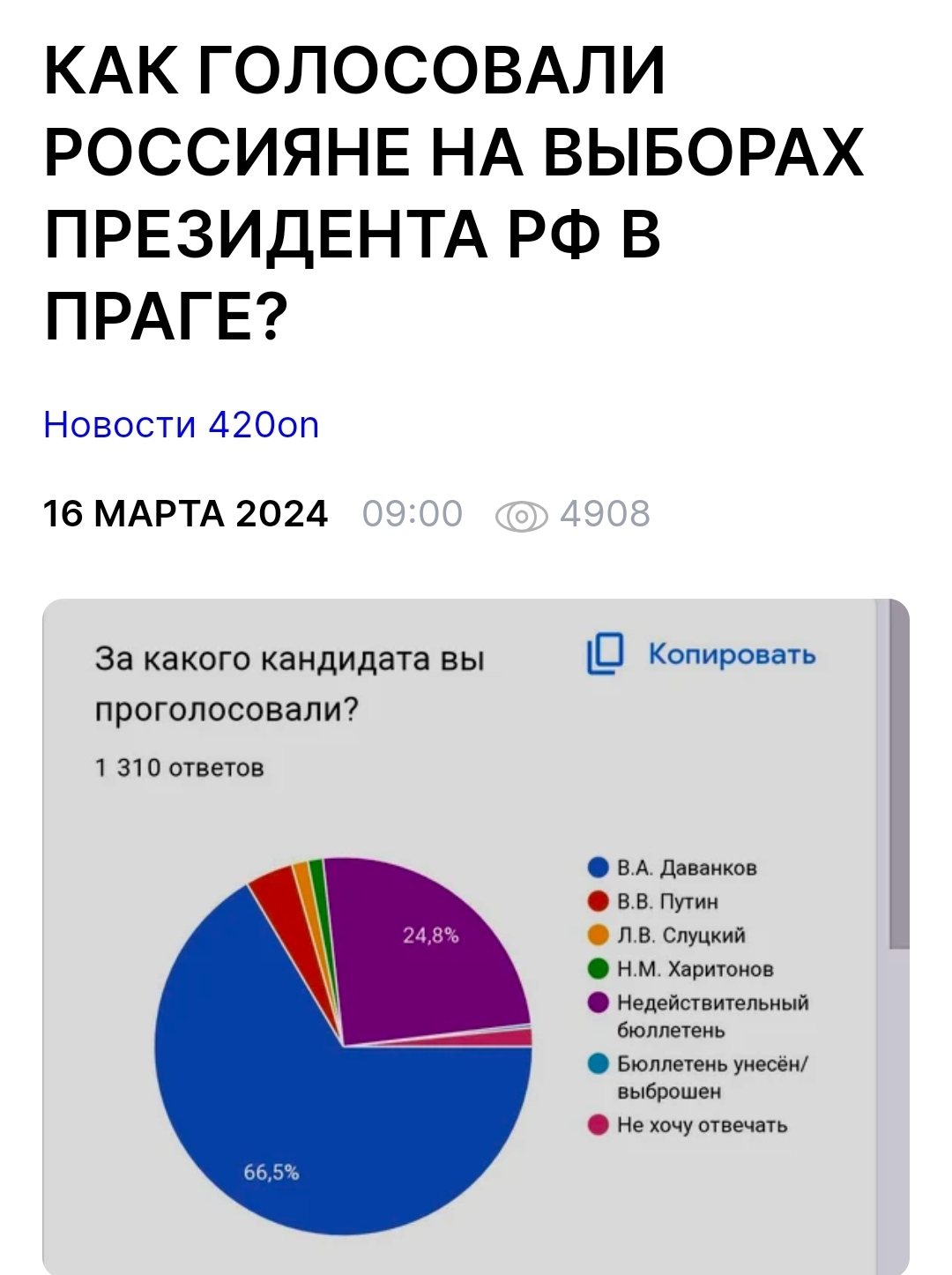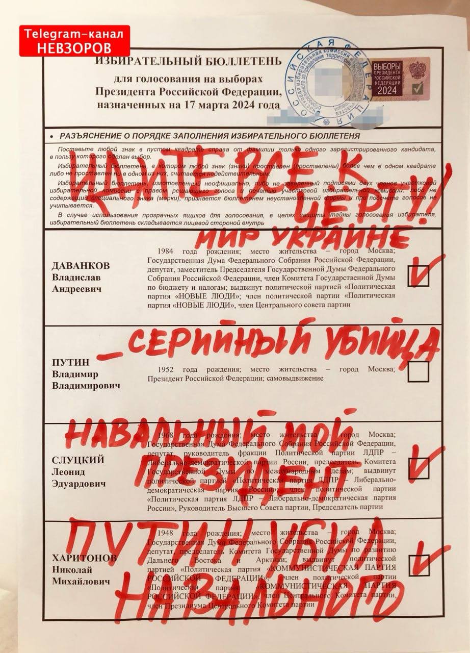 Дело вот в чем. Любой. Подчеркиваю, любой голос, не важно за хуйло или против и за кого то другого - легимитизирую незаконные выборы. Как уже говорилось результат они нарисуют любой. Им нужна явка, причем с любым голосом. И явка для них единственный показатель. Поэтому любой россиянин, проголосовавший на этих так называемых выборах хуйла - пособник фашистов и на его руках кровь убиваемых ежедневно украинцах. И тут так называемые хорошие русские показали свою фашистскую сущность. Единственный смысл посещения участка - это бросить коктейль Молотова, залить зеленку в урну для голосования или еще как-то испортить голоса. Все остальное - это фашистское самоуспокоение.