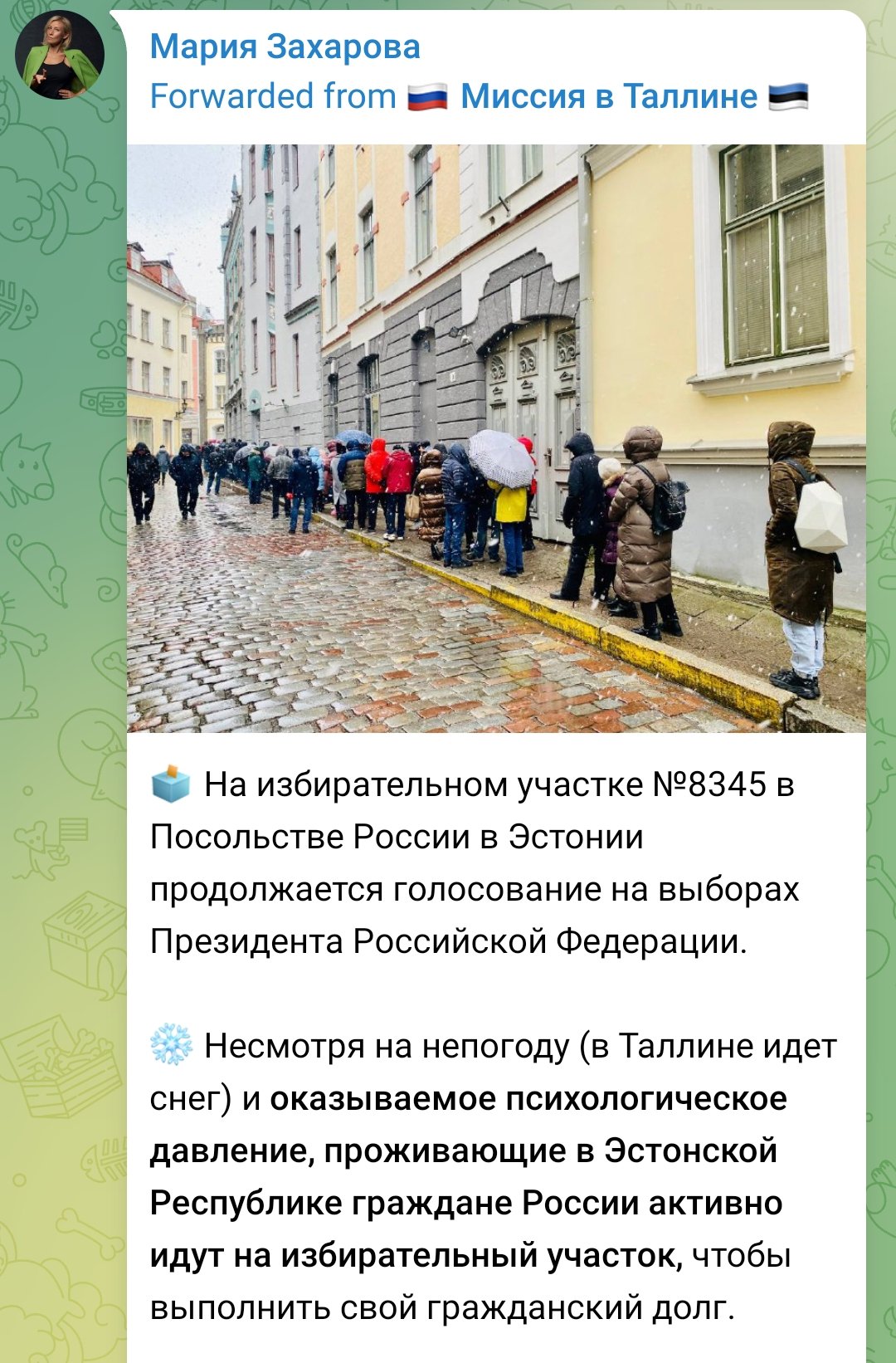 Ребята, вы феерические долбоёбы. Иностранные соцсети теперь полны фотографий с подписями "Русские в Праге стоят в очереди проголосовать за Путина" или, в лучшем случае, "Русские в Праге стоят в очереди чтобы принять участие в выборах".