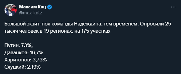 А сейчас? Роль Тихановской мог сыграть Надеждин, именно потому его не допустили. А Даванков это даже не смешно. Он получит свой 1 процент, и всем будет на это насрать.