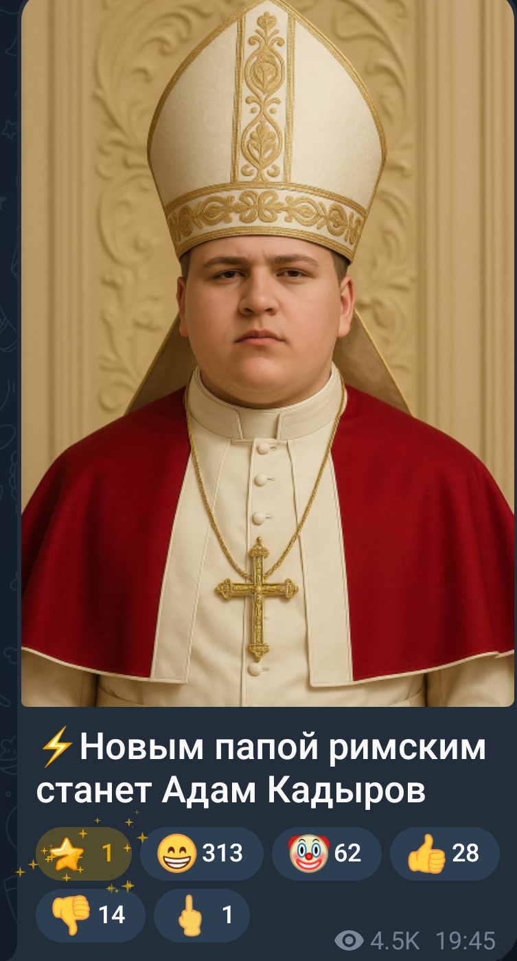 А я вот прочитал предложение, что новым Папой надо назначить Адама Кадырова! Такой должности у него ещё нет. Кадыров-старший должен нажать на Конклав. Адамчик молодой, папствовать будет лет семьдесят.