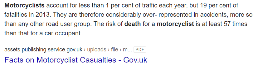 Motorcyclists account for less than 1 per cent of traffic each year, but 19 per cent of fatalities in 2013. They are therefore considerably over- represented in accidents, more so than any other road user group. The risk of death for a motorcyclist is at least 57 times than that for a car occupant.