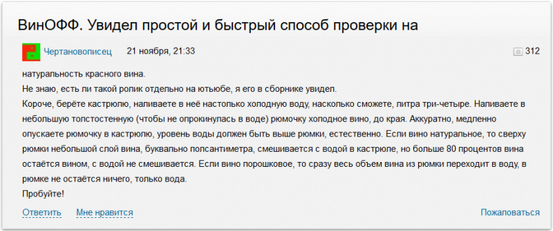 Ну ок, фальсифицировать маломальски неплохое вино невозможно чисто технологически. Но я чегото не сомневаюсь что наши(да и не наши) дельцы способны тупо юпи разбадяжить в воде, фигануть спирта, налепить наклейку и продавать как десертное вино... А если еще виноградное сусло добавить то вообще элитный напиток за 50 центов 😄