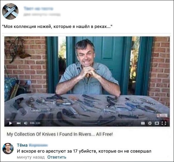 А когда вёз 20 видов ножей на съёмки в Лондон, то его в аэропорту задержали.