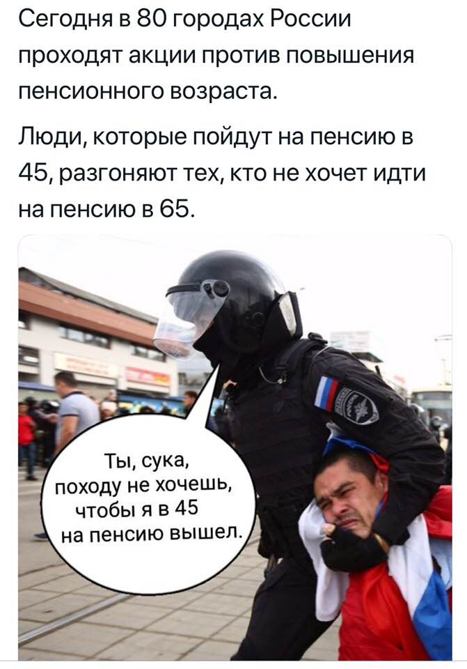 Я конечно счас походу дерьмецом тоже окажусь, но как говорится правда мне дороже - вот фотка ДО. Мальчик залез на столб - мальчика сняли со столба... Так же фото с девочкой которое с другого ракурса постили - сколько страдания на ее лице да? Вырывать из контекста или сфоткать под правильным углом можно любое событие выгодно для любой стороны, вот и всё что хотел сказать. Про пенсионную реформу мне как нероссиянину пофиг у нас лет 25 уже как с 65лет все идут и не жужжат.