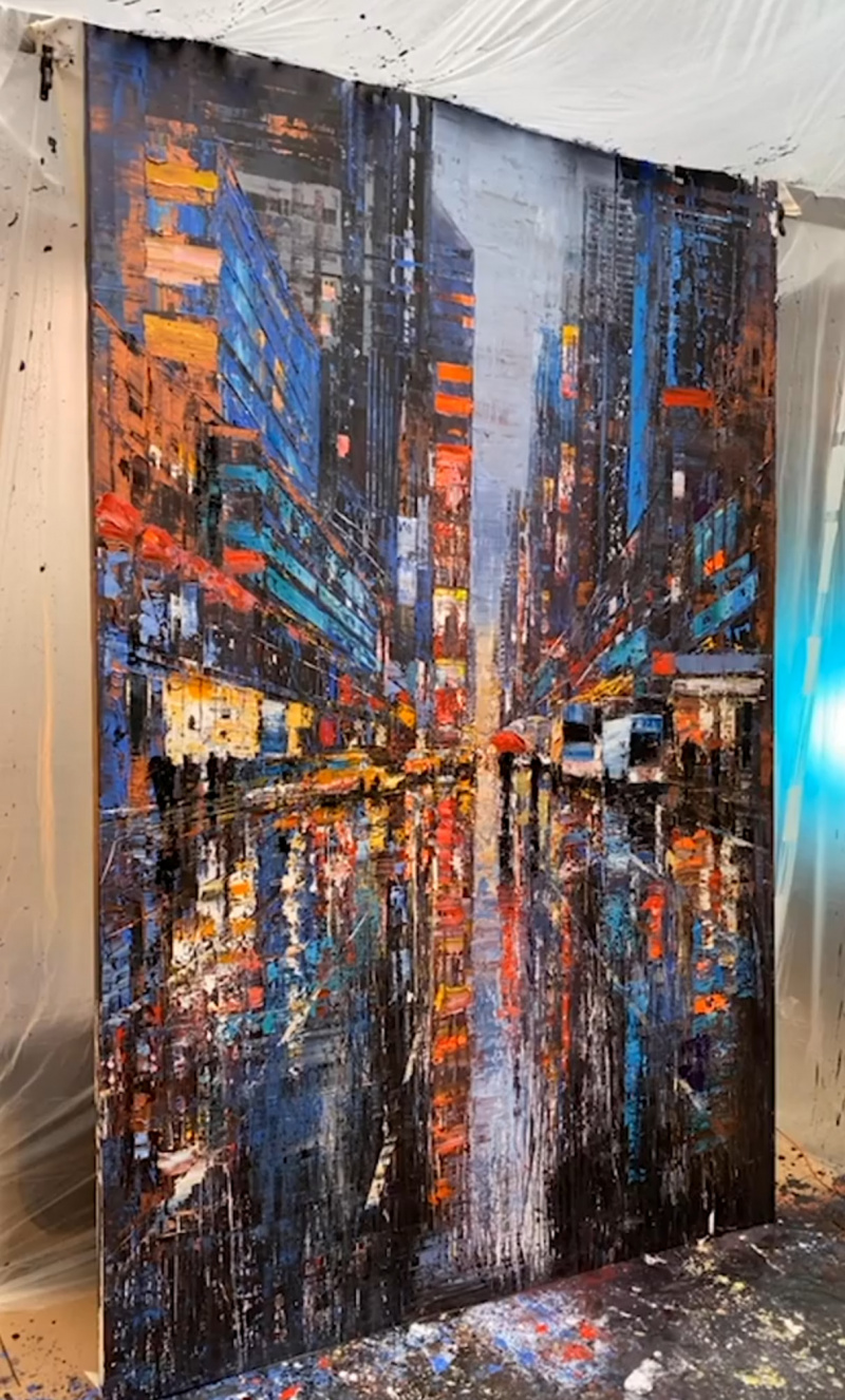 Художник Пол Кентон (Paul Kenton - его официальный сайт) известен прежде всего своими городскими пейзажами: он отлично умеет передавать в картинах энергию городов. Еще он известен своей интересной техникой создания больших полотен: он буквально выплескивает краски на полотно и действует крупными кистями, создавая вроде бы совершенно абстрактную картину, которая на отдалении превращается в городской пейзаж. Выглядит это очень интересно.