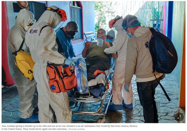 Ну и там еще подробно изложена история пожилой семейной пары американцев - Хосе Арельяно, ветерана ВМС США, и его жены Глории. Они проехали 2000 миль от дома до курортного города Оахака, Мексика. Там у Хосе начался приступ астмы, потом они с женой заболели коронавирусом, ну и в статье описываются их злоключения и то, как их сын организовывал их возврат домой. В итоге Хосе Арельяно умер, а семья получила счетов на сумму порядка миллиона долларов, причем страховка покроет не более 60% от этой суммы.