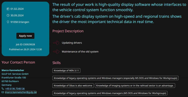 Что касается WIN 3.1 то она использовалась раньше в дисплеях в кабине машиниста на которых выводится основная информация (скорость, уровень тяги, напряжение контактной цепи, активная система останова (ATP) и информация о маршруте (EBULA)). При продаже локомотивов или пассажирских поездов производитель обязан в течении минимум 30 лет обеспечивать запчастями и (зависит от контракта) обслуживанием. Вот и получается, что произведенные в середине 90-х годов локомотивы и/или поезда до сих пор катаются с такими старыми дисплеями. Если у перевозчика есть средства то он может сделать модернизацию, но не всегда (я бы даже сказал почти никогда) это бывает рентабельно. Как правило к модернизации подталкивают все более ужесточающиеся требования регуляторов, но для очень старой техники (если ее немного и до конца запланированной эксплуатации остается немного времени) делают временные исключения, но ремонтировать и поддерживать ее в рабочем состоянии все равно нужно. Вакансия скорее всего все таки Deutsche Bahn а не Siemens, тк Siemens не выпускает дисплеи с WIN3 уже лет 10 точно.