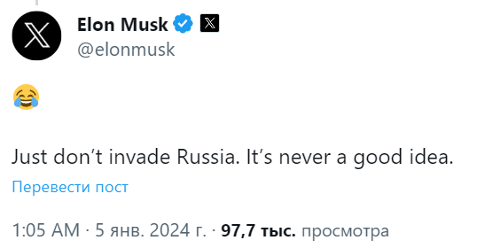 Маск все же писал про вторжение в России, а не про войну с Россией.