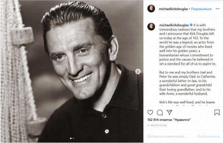 В возрасте 103 лет скончался легендарный американский актер Кирк Дуглас (Исер Данилович / Демский). Об этом сообщил в Инстаграме его сын Майкл.
