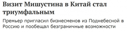 Широко разрекламированный и уже названный "историческим" визит Мишустина в Китай, насколько я сужу по независимой прессе, по сути стал пшиком. Нет, конечно, в российских изданиях не скупятся на слова "триумфальный" и "судьбоносный", там рассказывают о том, что китайцы в очередной раз восхитились, а болгары пришли в восторг.