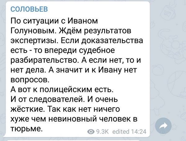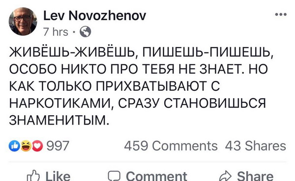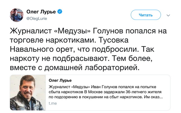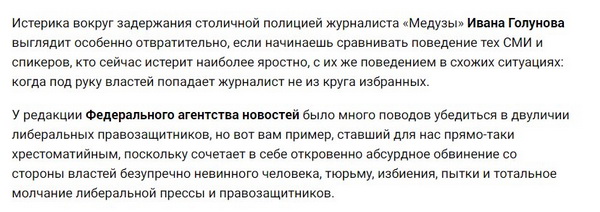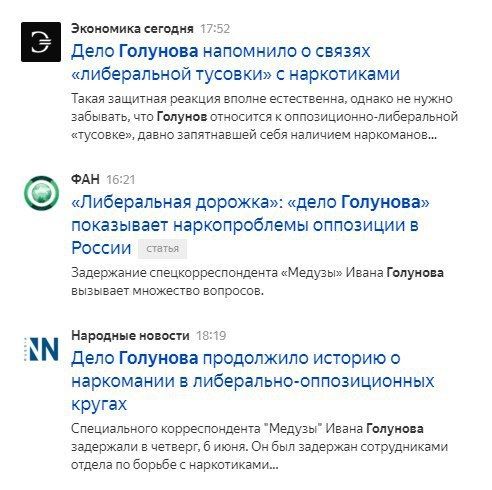 Не хватает, Алекс, в вашей подборочке вашего коллеги/ конкурента по долгожительству авторских сайтов в РФ. С ядовитой ухмылочкой он недвусмысленно объяснил всем вчера в своём 84 выпуске новостей, что "наркотики в рюкзаке были, а вот журналисты почему-то этому не верят". Понять, почему он занял такую позицию можно, т.к. он сам бывший оперуполномоченный. Но, опять же, в интервью с ним слышал, как в 90-е годы, пока он служил в милиции, бандиты предлагали ему большую взятку за противоправные действия, которую он, видимо, не взял. А типа теперь что-то поменялось. Да, наверное поменялось. Теперь бандиты в другой форме ходють 😄