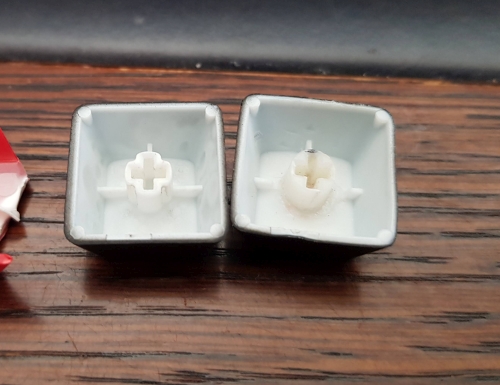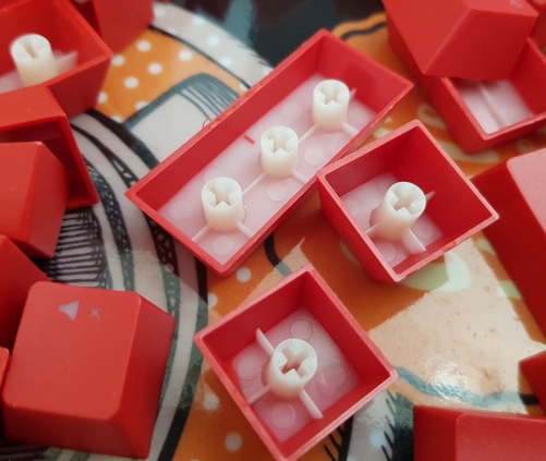 Не такие как красные, а чтоб гарантированно треснуло. Ремонтировал, ремонтировал. Потом на алишечке нашел набор всех кейкапов за пицот рублей. Часто поменял, часть восстановил, используя штыри от новых. Ну и котэ на принтскрин 😄