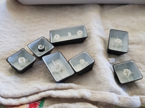 Я от отчаяния даже разобрал клавиатуру, чтобы посмотреть, можно ли что-то сделать, но увидел только то, что клавиши там все равно несъемные и закреплены на плате, так что сделать ничего нельзя.