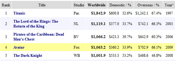 Alex Exler: Пять фильмов, заработавших более миллиарда во всемирном прокате. У "Аватара" при этом, конечно, еще не вечер. Я уверен, что с продажами DVD и BR будет за два.