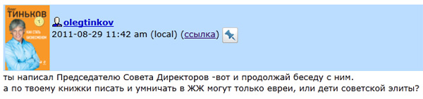 Удивительное дело! Когда читал это тёмино обращение, даже и не подумал о том, что г-н тиньков будет там отвечать в каментах. Как обычно - реальность обгоняет самые смелые фантазии...