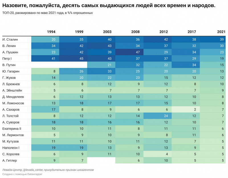 Опрос Левады-центра (признан инагентом и врагом народа) по поводу того, кого россияне считают самыми выдающимися людьми в истории. Впрочем, сам термин "выдающийся" - он довольно расплывчатый. Например, Сталин - совершенно точно выдающийся человек с точки зрения того, какое количество людей в СССР было уничтожено по его приказу. Тут, конечно, с ним мало кто сравнится. Хотя Ленин в этом деле тоже весьма преуспел. Он тоже действительно выдающийся. Единственное - тогда не понятно, почему А. Гитлер, которого определенные россияне также назвали выдающимся, совсем не в первой пятерке. Вот это странно, конечно.