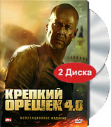 В чем, спросите, коллекционность и на черта там вообще два диска? Объясняю. Там еще будет фотогалерея (понадергали фоток отовсюду), музыкальные видеоклипы (Борис Моисеев и Дима Билан поют о своих крепких орешках), Потап & Настя Каменских "Крепкие орешки", Guyz Nite "Die Hard", "Не тот парень, не то место, не то время: Крепкий орешек. Взгляд назад", "Продолжение приключений Джона Маклейна", Трейлеры "Крепкий орешек 4.0".