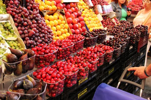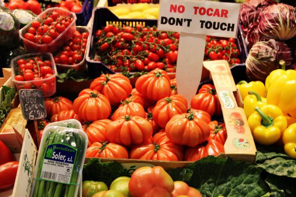 Какие-то экзотичные помидорчики. Всяк норовит пощупать, судя по всему.