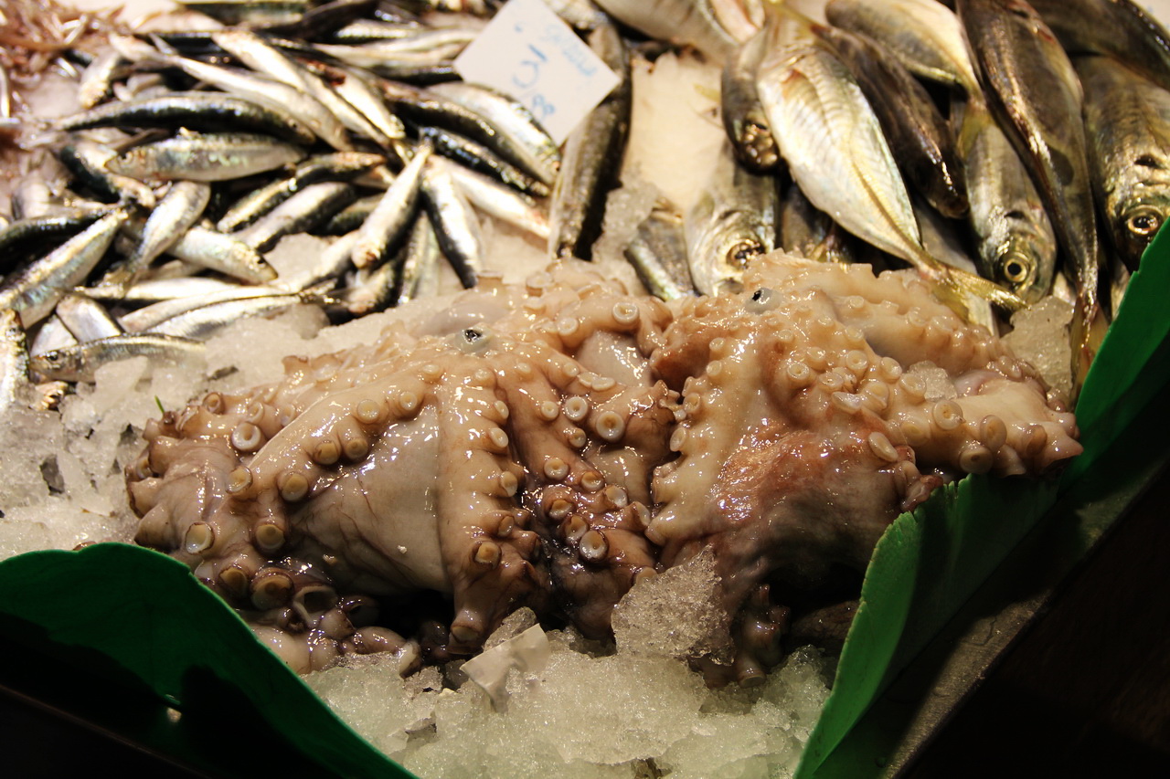 Осьминог. Я его готовить пока так и не научился. Говорят, что его сначала нужно замораживать - иначе будет совершенно резиновый. После этого - долго варить. И потом уже можно жарить с лучком или еще чем-нибудь.