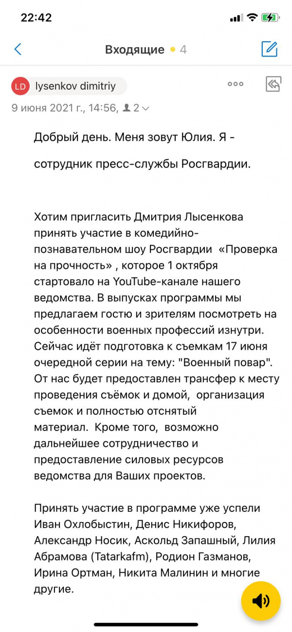 Актер Дмитрий Лысенков ("Вампиры средней полосы", "Шторм", "Домашний арест", "Бедные люди") выложил в своем Facebook интересное предложение, пришедшее ему от пиарщицы "Росгвардии".