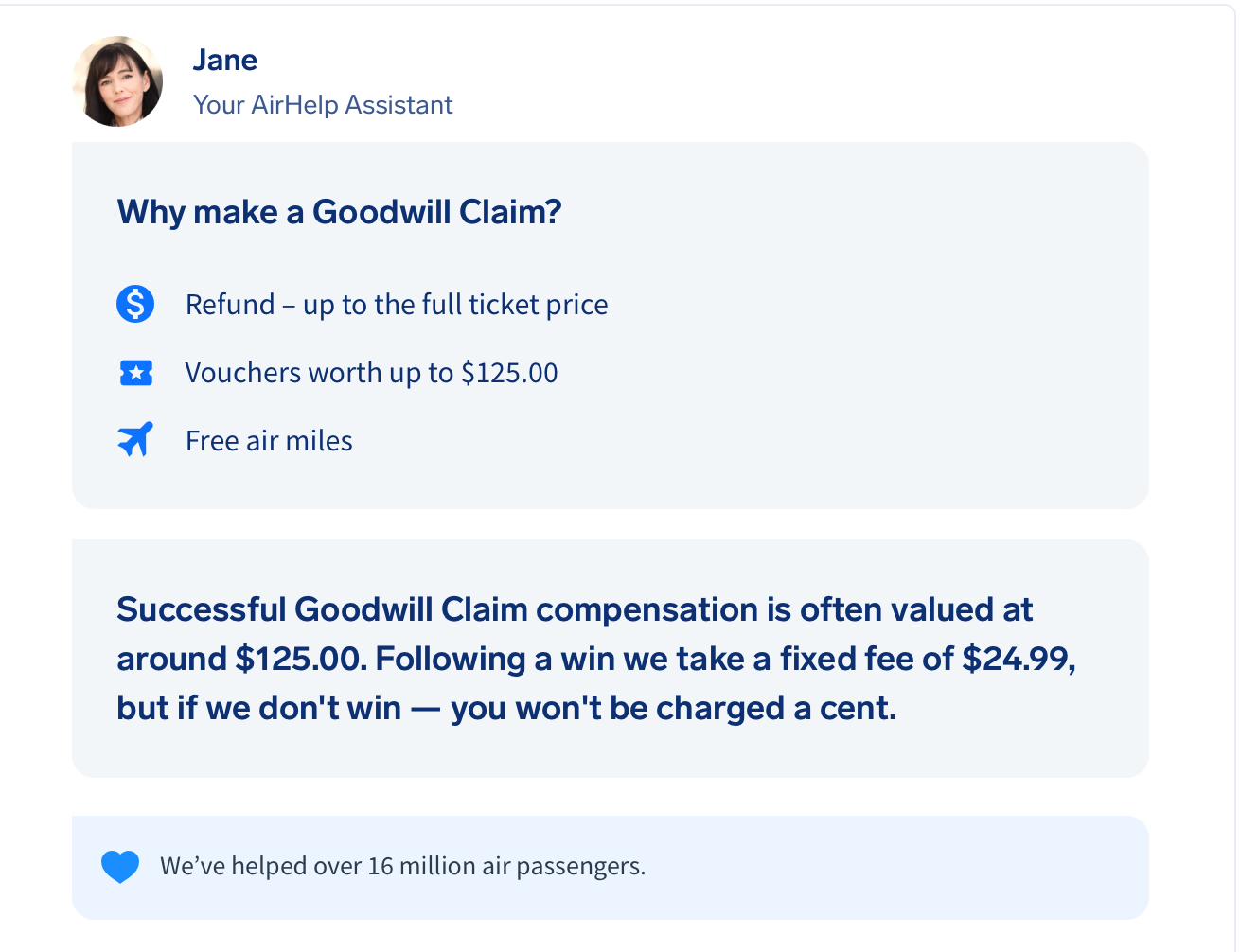 Я только что вбил абстрактные данные и мне положена компенсация! За перелёт из США в Мексику месяц назад. Но надо оставить данные карточки, если я согласен на мировую, то мне дадут €125: