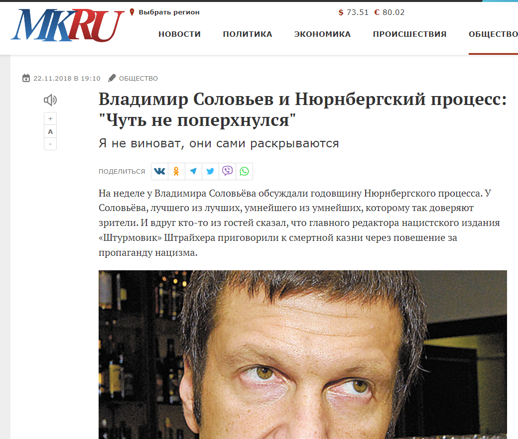 Неужели Соловьёв воспринял накат на Штрайхера как на самого себя? Ну какая может быть связь между доблестным борцом с укрофашистами и немецким нациком? Никакой связи, даже намека нет. Но Соловьёву почему-то кажется…