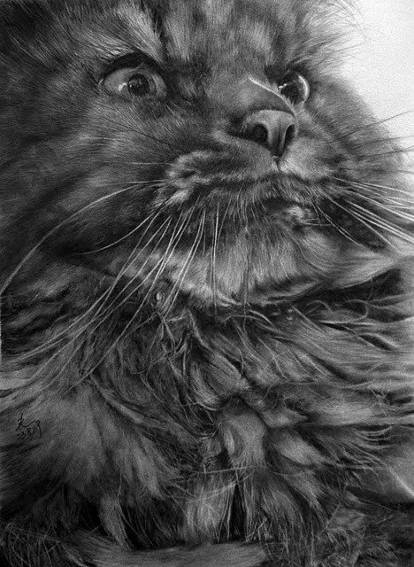 Такой уровень детализации шерсти просто невообразим при живом коте - не будет он неподвижно лежать столько времени, сколько надо на то, чтобы так подробно все нарисовать. То есть все же сначала сфотографировано, а потом уже срисовано с фотографии. Представляю сколько времени на это ушло. А смысл? Фотографию так обработать можно за несколько минут. Просто нравится человеку руками делать работу фотошопа? Или даже принтера? Я далек от искусства, но ведь здесь к фотографии (хорошей, спору нет) не добавлено абсолютно ничего. Пустая трата времени?