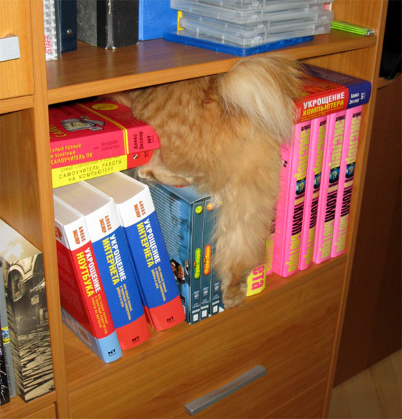 И тянется, надо заметить, к "папочкиным" книгам. Кошачий патриотизм.