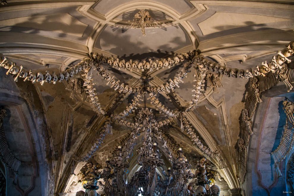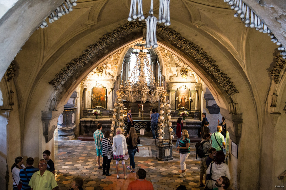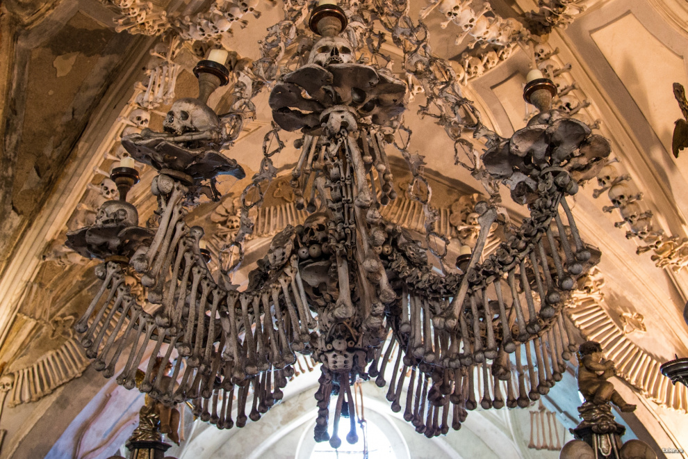 Мастер отбелил кости и начал украшать ими выстроенную большую часовню. В результате - получился памятник культуры, созданный из останков нескольких десятков тысяч человек. И этот памятник привлекает толпы туристов, которые приходят сюда или подумать о бренности всего сущего, или насладиться красивыми видами огромной люстры, дарохранительницы или герба Шварценбергов - все это сделано из костей.