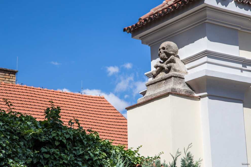 Вот такой симпатичный значок расположен перед воротами территории костницы - он сразу настраивает на нужный лад.