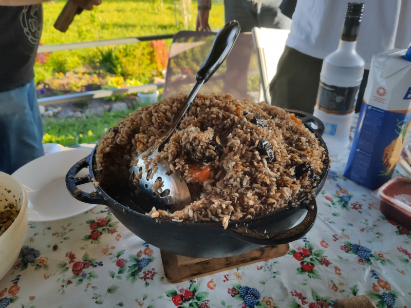 Разумеется, мы не могли оскорбить Мастера Плова тем, что мы ушли бы играть в крокет, оставив это произведение искусства остывать, поэтому мы набросились на плов, запивая его крепкими напитками, так как плов был классический, с бараниной, ну и потрясающе вкусный. Впрочем, от Мастера Плова мы ничего другого и не ожидали.