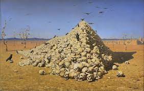 "В 1867 году Верещагин уехал в Туркестан, где он состоял прапорщиком при кровавом генерале К. П. Кауфмане. Россия тогда покоряла эти земли, и Верещагин насмотрелся на смерть и трупы, вызвавшие у него сострадание и человеколюбие."