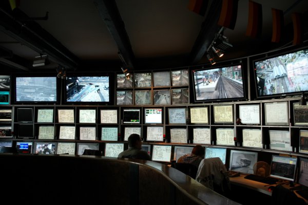 Продолжаем разговор о крупнейшем в мире макете с железными дорогами - вот первый выпуск. В прошлый раз я не написал, а это не совсем очевидно, что все поезда на этой огромной территории находятся в непрерывном движении. 700 составов носятся туда-сюда, переходят на другие пути, стоят перед семафорами и так далее. Управляются составы вот из этого центра управления, в который могут зайти любые желающие и полюбопытствовать - там очень интересно.
