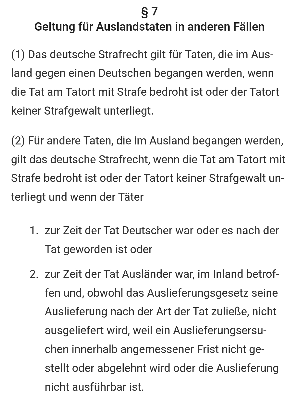 Для того, чтобы прокуратура начала расследование, нужно, чтобы или преступление было совершено на территории Германии, или немецкий гражданин подозревался в совершении тяжёлого преступления в другой стране.