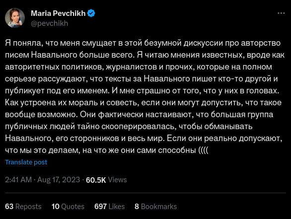Письмо действительно странное. Все с кем ФБК в этом году конфликтовал вдруг по совпадению оказались в этом тексте. Плюс непонятная хрень с книгой Гуриева, добавим какой-то прям уж совсем стыдный провластный нарратив о зловещих 90х и собственно сам факт публикаций текстов прям из российской тюрьмы, вероятно у нас самая гуманная система исполнения наказаний, и у получается действительно какая-то загадка. И хрен знает чё происходит. Меня конечно ФБК давно бесит, но вот прям готовы подделывать письма своего лидера? А вдруг письмо действительно Алексея, которого просто немного бомбануло, два года чела пытают всё-таки.