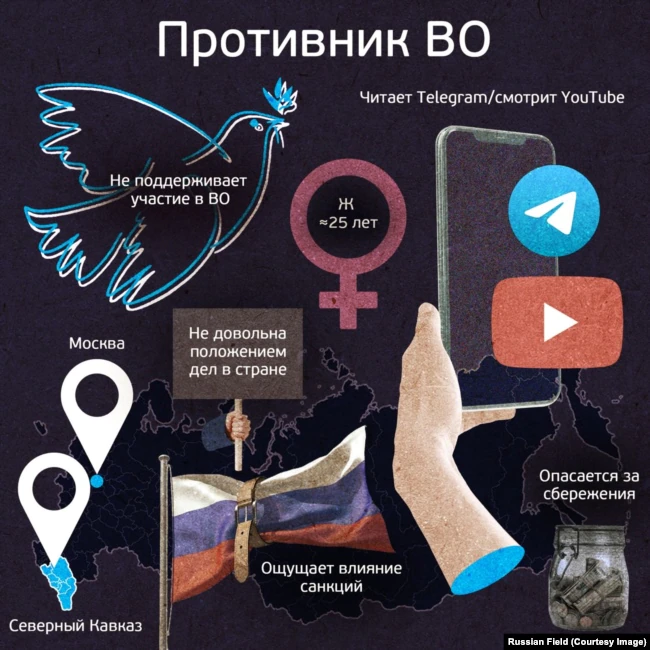 Мы делали совместные портреты, чтобы по каждой социальной группе можно было анализировать. Единственное, при анализе портретов важно понимать – это не абсолютно, мы лишь показываем большинство и меньшинство. Не вся молодежь – против военной операции, и не все пенсионеры – за. Есть основополагающие критерии: в большей степени противники – молодые люди в возрасте от 18 до 29 лет (до 18 у нас цифр нет). Это люди скорее малообеспеченные, чем богатые. Это, скорее, образованные люди – либо с высшим профессиональным образованием, либо с ученой степенью. Это москвичи, Москва – самый пацифистский регион, показали многие исследователи. Это зачастую сотрудники либо сферы науки, либо сферы рекламы, банковской сферы, то есть тех сфер, которые сильно пострадали, студенты, раз мы говорим про молодежь. Распределение по источникам информации. Те люди, которые получают информацию из интернета, из инстаграма, телеграма, с сайтов интернет-СМИ, здесь я подразумеваю в первую очередь независимые СМИ, как ваше, как "Медуза" и так далее. Это те, кто недоволен положением дел в стране, своим доходом, работой власти. Зачем нам пытаться что-то забрать, если мы у себя порядок навести не можем, такой простой и понятный месседж у всех в головах. Также это люди, которые опасаются за свои сбережения, их задело напрямую. Люди, которые считают, что русские и украинцы – разные народы, это важный момент. Еще интересно – тут не такая большая разница, но те, кто против военной операции, путешествуют несколько чаще за пределы СНГ. То есть у людей шире кругозор, они по-другому смотрят на вещи, по-другому анализируют положение дел внутри нашей страны.