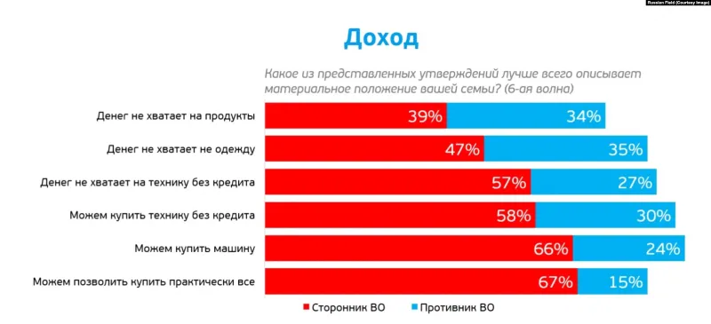 Результаты социологических опросов в нынешней России? Даже не знаю - смеяться или плакать... А какие были результаты подобных опросов в Германии осенью 1939 года? "Чем богаче люди, тем больше они поддерживают эту войну." Да если человек из категории "могу купить практически всё" в опросе, пусть даже неофициальном и осуществляемом в рамках частного разговора, начнёт высказываться против войны и против режима, то очень быстро переместится в противоположную категорию, где трудности с покупкой продуктов. Или где вообще покупками не надо заморачиваться - харчи казенные, баланда и пайка...