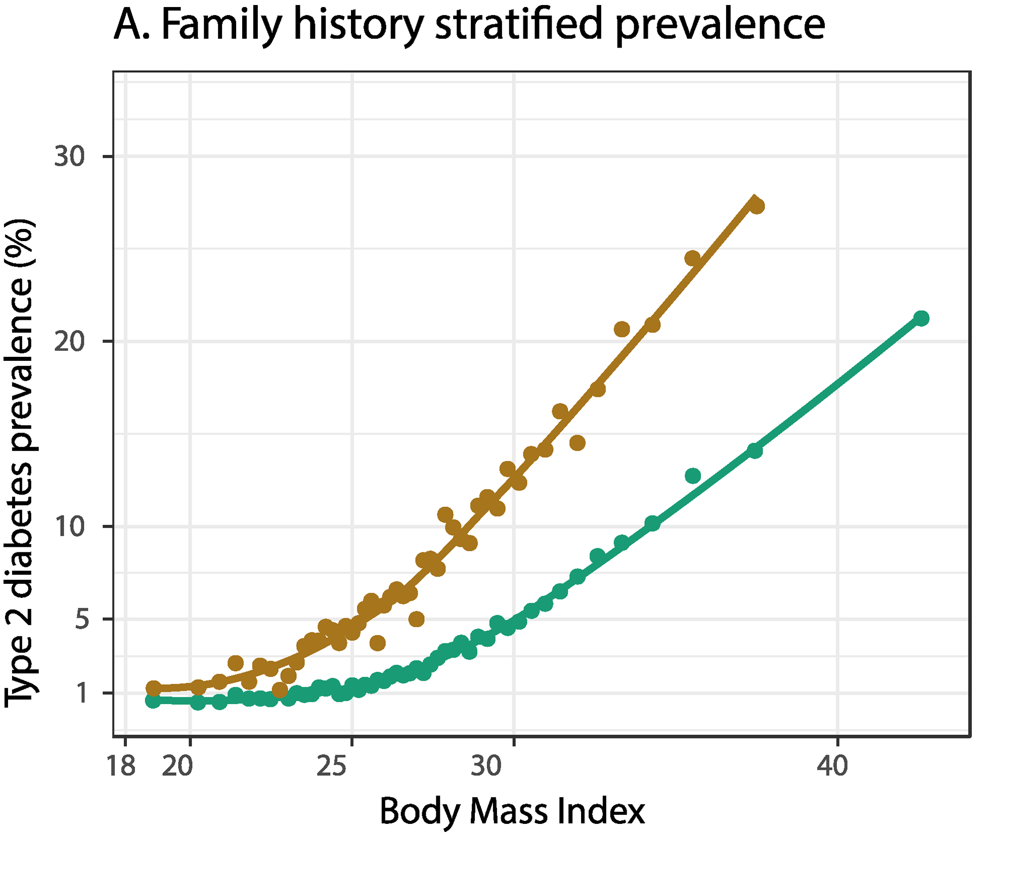 Вообще диабет - это почти исключительно заболевание от лишнего веса. Как видно из графика, генетическая составляющая тоже есть. Но при индексе массы тела 20-21 риск минимален.