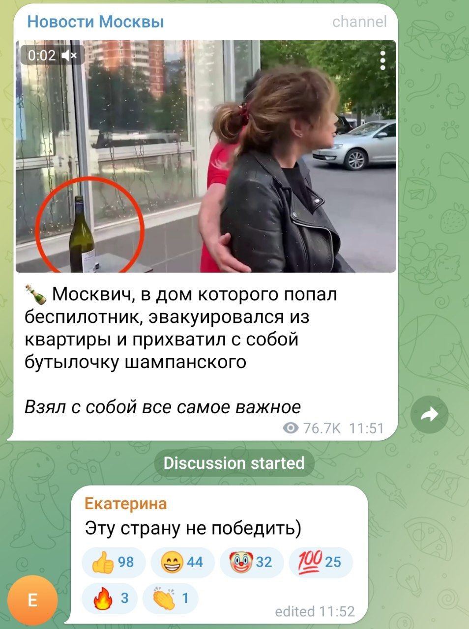 Так чего переживать москвичам? Ударили по рублёвке. Судя по реакции соловьева это вызвало неподдельную радость у россиян. Думаю и москвичей тоже. Доставили простым русским людям радость и немного взбодрили недюдей. По сравнению с террором Киева это пустяки. И заметь, даже такие пустяки очень радуют русских людей. Это же замечательно!