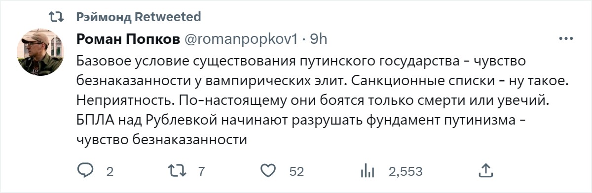 * Не замечаю вообще, чтобы в России гнобили военных, силовиков, чиновников, их семьи. Жалуются "Мы мирные жители", но сами не то что не протестуют против войны, но и продолжают брататься с военными, полицейскими, ездить с ними на шашлыки и отмечать ДР. Ведь их брат, сват или друг со школы совсем не виноваты, никого не убивали, а в армии они служат для того, чтобы детей кормить. Ну-ну. Офицерам СС тоже детей надо было кормить.