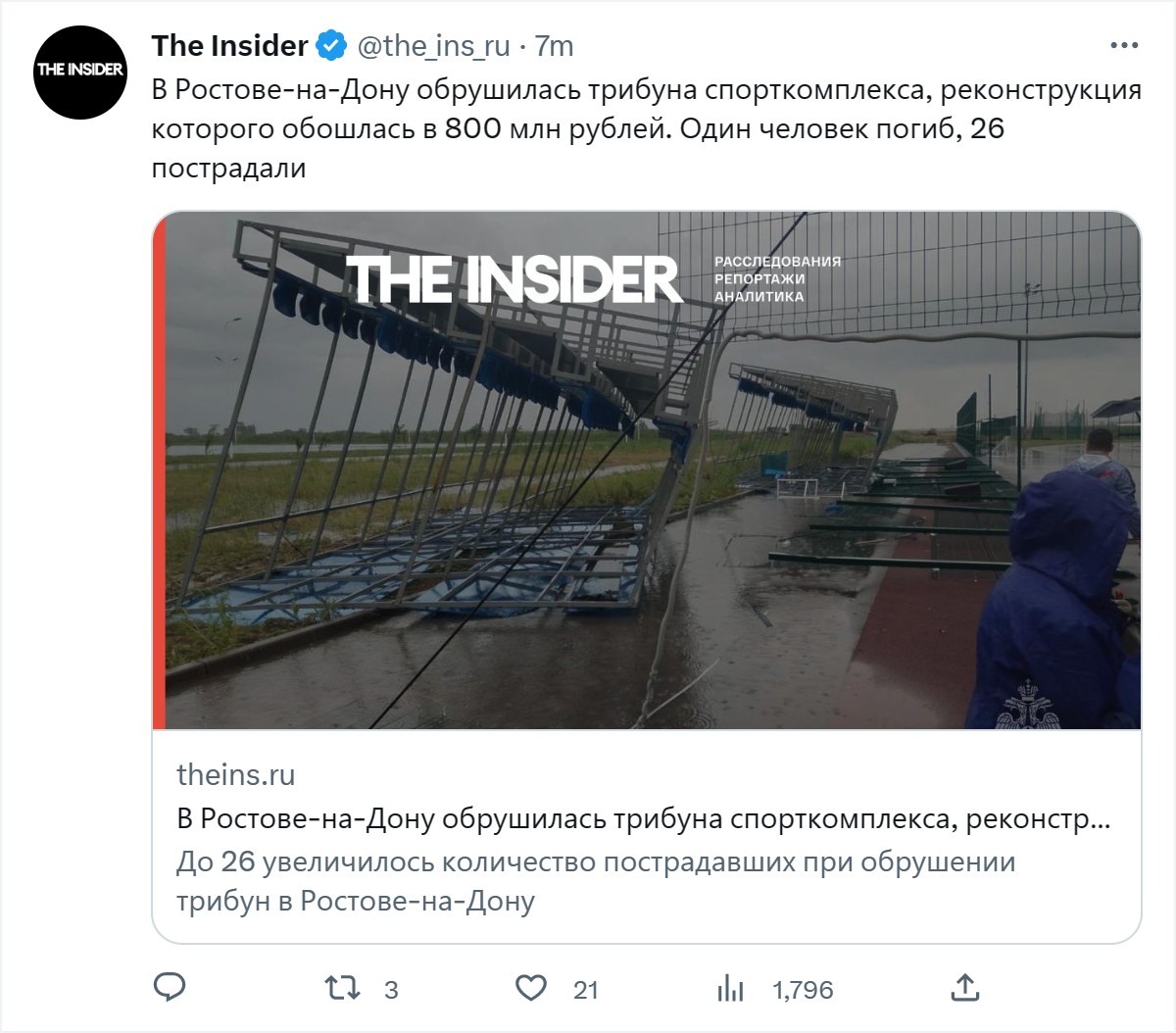 А на скриншотах - реальный сегодняшний теракт, которые происходят сплошь и рядом, просто привычный и потому не такой заметный - их даже террором никто не называет. Погибла женщина, 26 человек в больнице, большинство - дети, часть в серьезном состоянии; у него и спонсоры есть - недорогие россияне еще его и оплатили в размере каких-то 800 миллионов. Как думаете - кто-нибудь ответит (ну, может, кроме какого-нибудь слесаря)? И где у жителей рф больше шансов погибнуть - от прилета чего-нибудь, или от вот такого бытового события - провалиться во что-нибудь свежеотремонтированное, умереть от непоставленного вовремя диагноза потому, что на деньги на медоборудование кто-то построил себе дворец - и т.д. и т.п.?