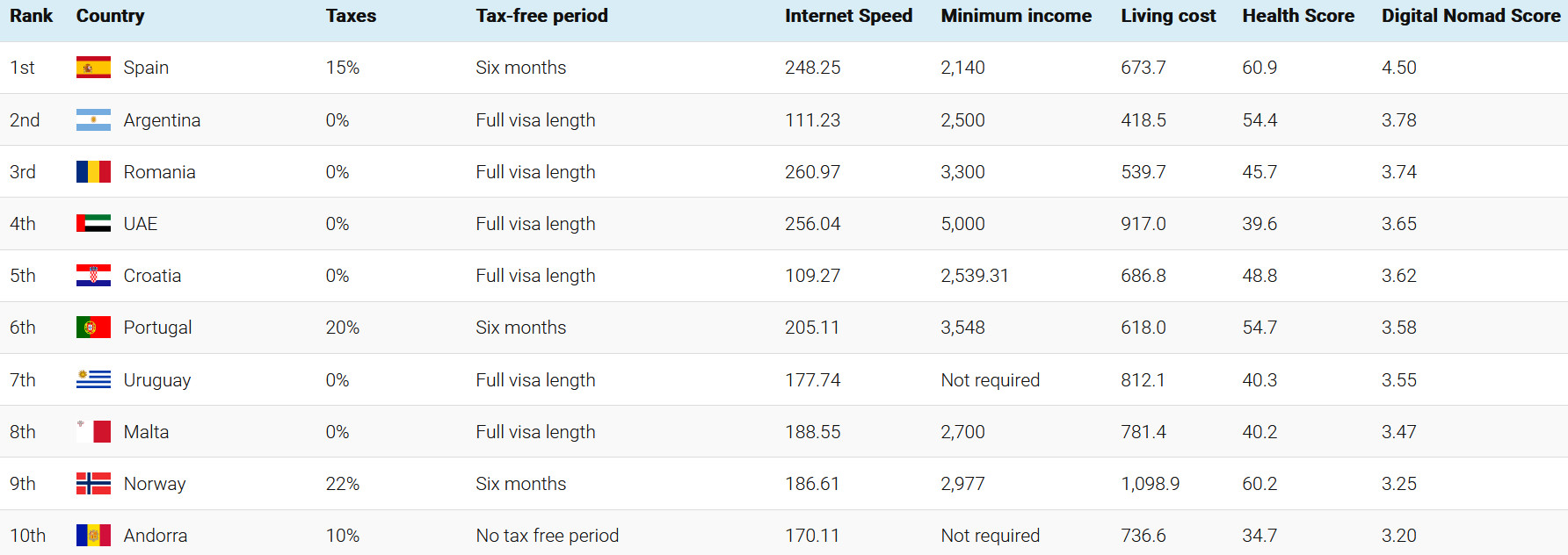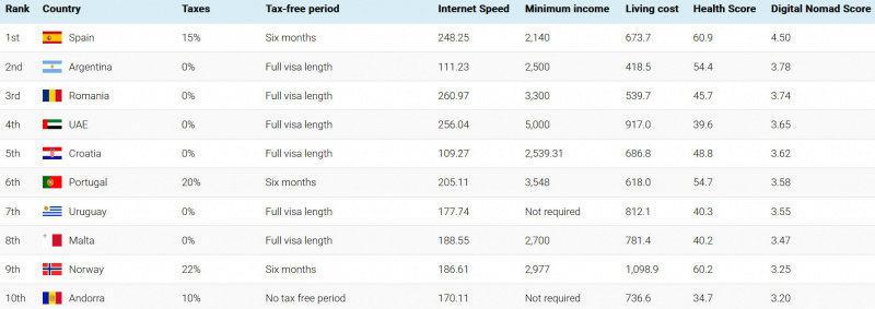 Согласно этому индексу, Испания занимает первое место среди стран, подходящих для цифровых кочевников, с оценкой 4,50 балла. За ней следует Аргентина, занимающая 2-е место с показателем 3,72. Румыния, Объединенные Арабские Эмираты и Хорватия занимают 3, 4 и 5 места соответственно, завершая пятерку лучших стран для цифровых кочевников.